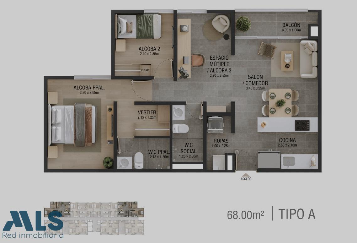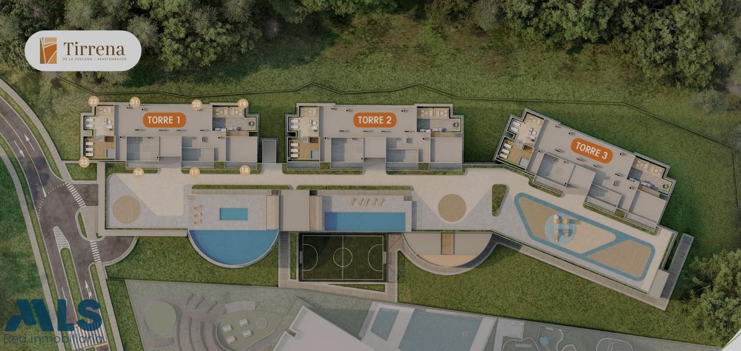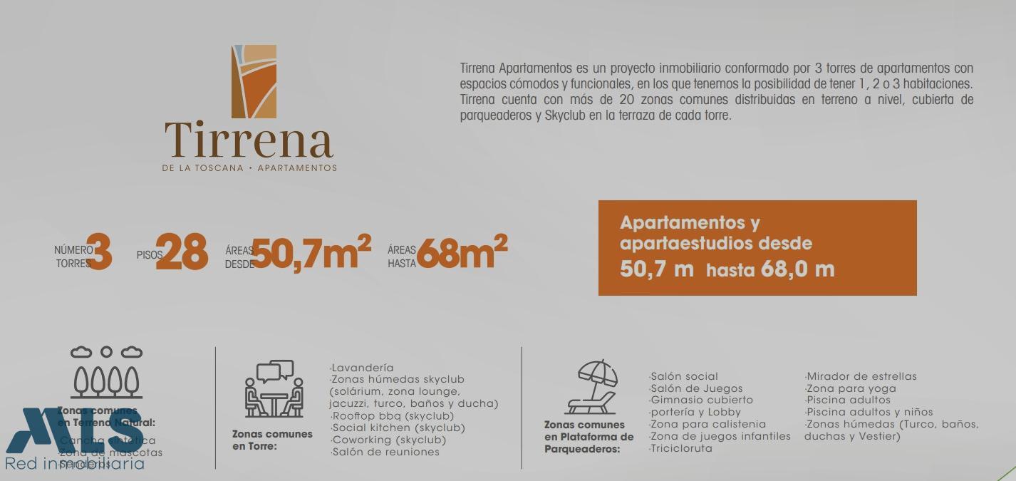 Tirrena Apartamentos es un proyecto inmobiliario conformado por 3 torres de apartamentos con espacios cómodos y funcionales, conformadas por 28 pisos, 8 apartamento por cada planta, 2 ascensores en la torre. Cocina, Sala-Comedor, 2 habitaciones 2 baños, estudio. Parqueadero y cuarto Útil. Se entrega en obra gris para que lo adecues como quieras! Zonas Comunes: Zona de Mascotas, Cancha de Futbol, Sendero, Lavanderia, Zona Humeda, Coworking, Gimnasio, Sala de Reuniones, Salón Social, Zona de Juegos, Pscina para Adultos y niños, Zona BBQ, Zonas Verdes, Zona de Yoga y Pilates, Entre otras mas.